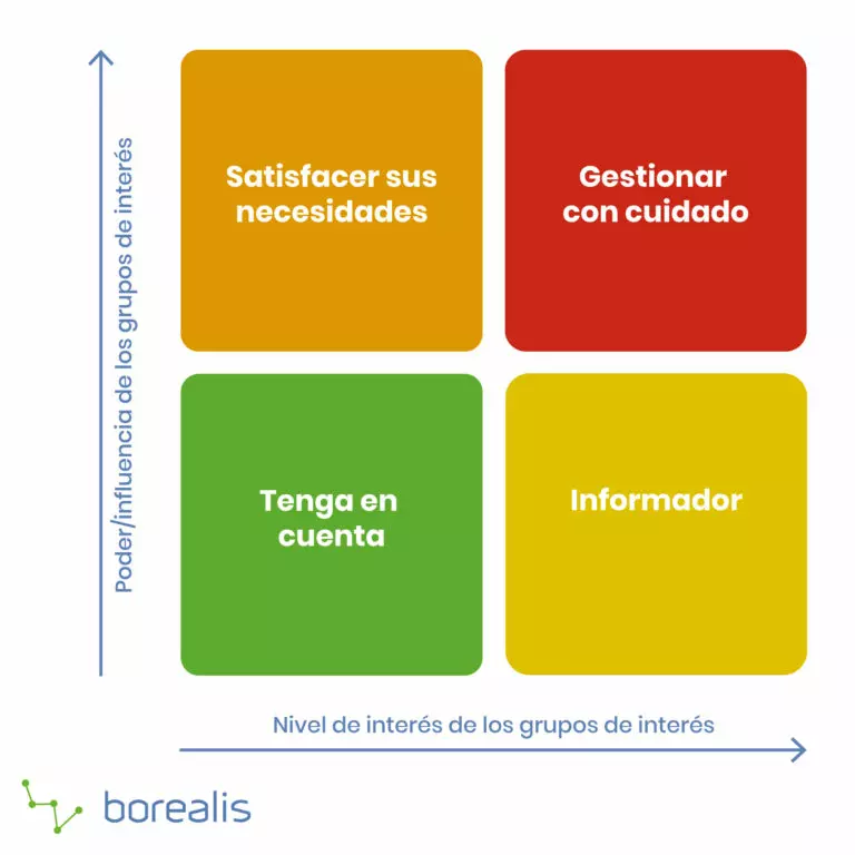 Es una herramienta de uso común en la que los grupos de interés se representan en una matriz en función de su poder (influencia) e interés (nivel de preocupación) en relación con un proyecto o decisión.